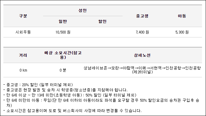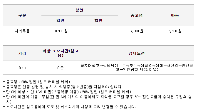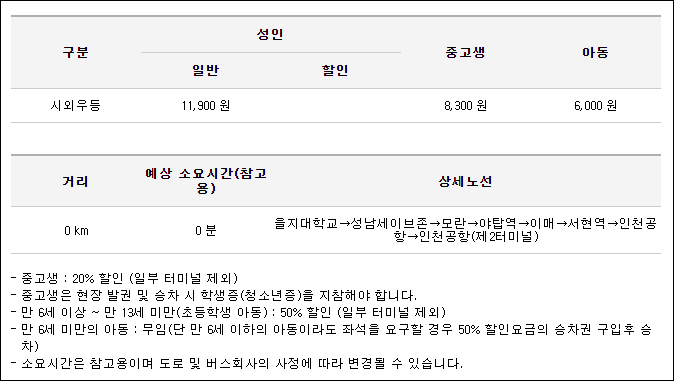 * 리무진 버스 요금 : 아래 표를 참고하세요