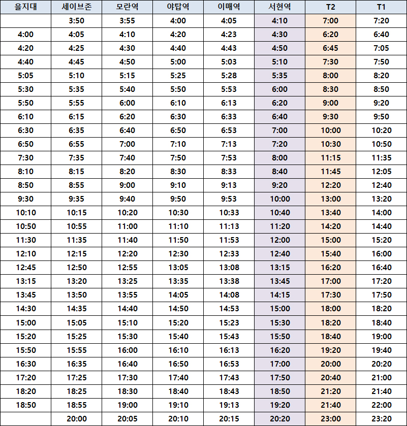 을지대학교에서 출발하는 첫차는 새벽 4시며 야탑역 첫차는 4시, 이매역은 4시5분, 서현역은 4시 10분에 첫차가 있습니다. 이어 15~40분에 한대씩이며 막차는 기점을 경우 20시, 모란역 20시 5분, 야탑역 20시 10분, 서현역 20시 20분이니 늦지 않아야겠습니다.