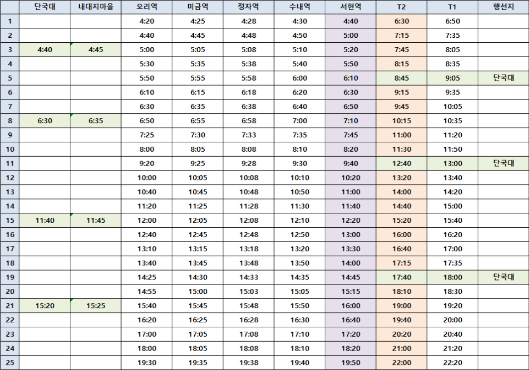 미금역 4시 25분, 정자역 4시 28분, 수내역 4시 30분, 서현역은 4시 40분 다른 차량으로 출발하게 됩니다. 단국대에서는 4시 40분이네요. 배차간격은 20 ~ 30분입니다.