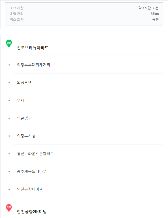 의정부 출발 - 의정부터미널 - 부대찌개 거리 - 의정부역 - 의정부3동 우체국 - 의정부시청 - 송추계곡 - 인천공항1터미널