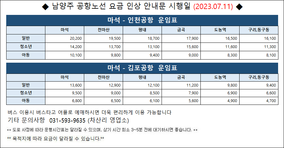 인천공항2터미널 첫차 : 오전 8시 10분 출발 ~ 남양주 10시 30분, 마석 10시 55분 도착
