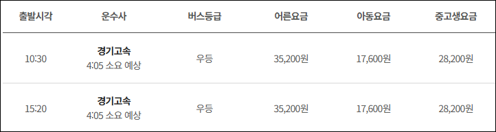 막차 : 15시 40분 출발 ~ 18시 29분 도착