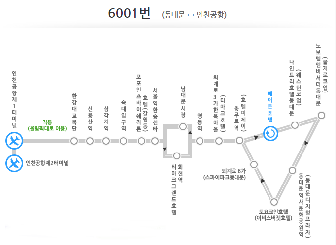 동대문 베이튼호텔 - 나인트리호텔 웨스턴코업 - 노보텔동대문 을지로 코업 - 동대문역사문화공원 - 토요코인 호텔- 스파이파크 동대문 - PJ호텔 - T마크 호텔 - 명동역 - 남대문 - 서울역 - 숙대입구 - 삼각지 - 용산우체국 - 신용산 - 인천공항