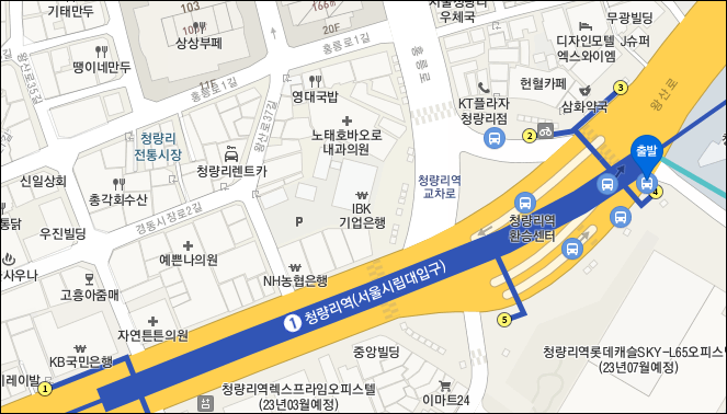 리무진 버스노선 : 청량리 - 서울시립대 - 신답역 - 동대문구청 - 흥인지문 - 종로 1, 2, 3, 4가 - 경희궁 - 충정로역 - 이대입구 - 신촌역 - 신촌현대백화점 - 홍대입구역 - 합정역 - 인천공항