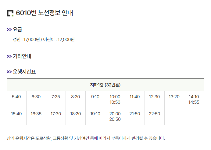 평일첫차 : 6시 출발 ~ 막차 : 23시 10분 출발