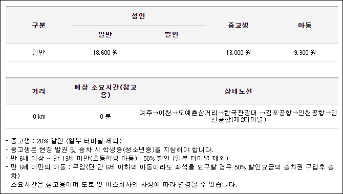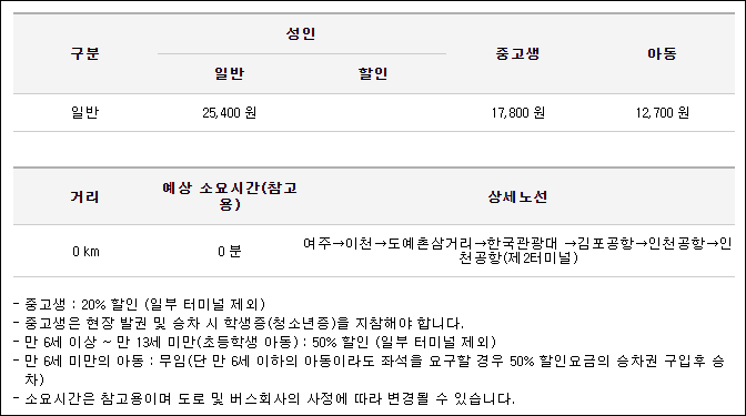 여주에서 인천공항으로 가는 리무진 버스 첫차는 6시 30분이며 막차는 12시 30분이네요. 인천공항1터미널까지 180분, 2터미널까지 200분이 소요되며, 노선은 이천과 김포공항 경유해 인천공항으로 가게 됩니다. 리무진 버스 요금은, (인천공항) 어른 25,400원, 청소년 17,800원, 어린이 12,700원 , (김포공항) 어른 18,600원, 청소년 13,000원, 어린이 9,300원이며 학생은 학생증을 지참해야 할인을 받을 수 있으니 참고하세요.