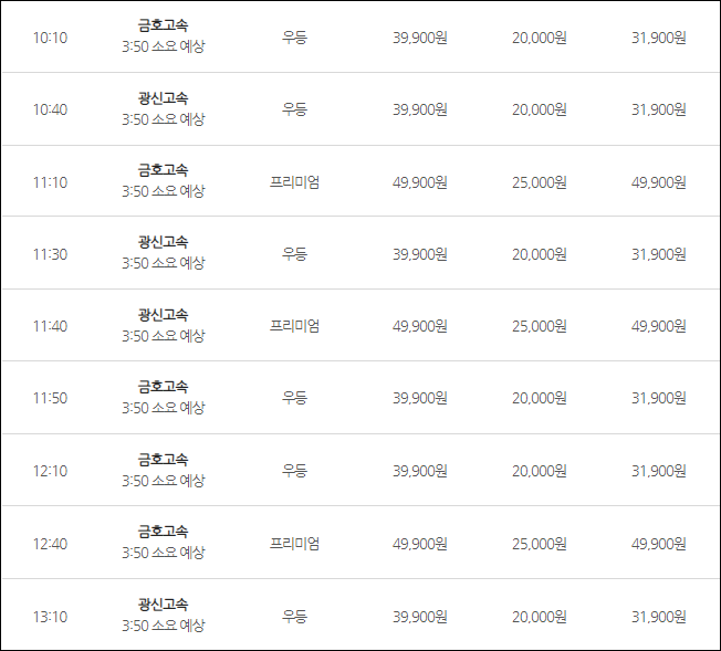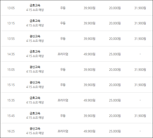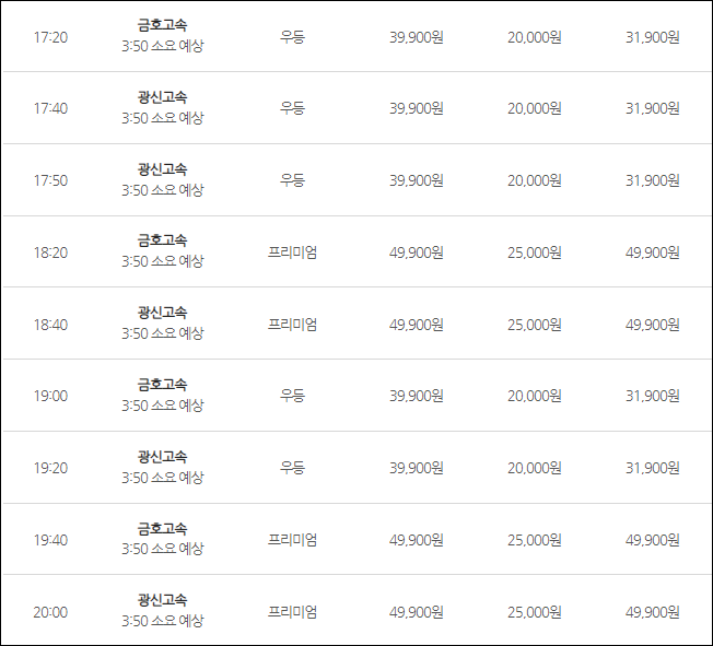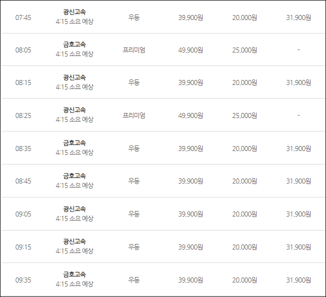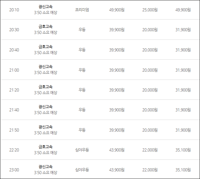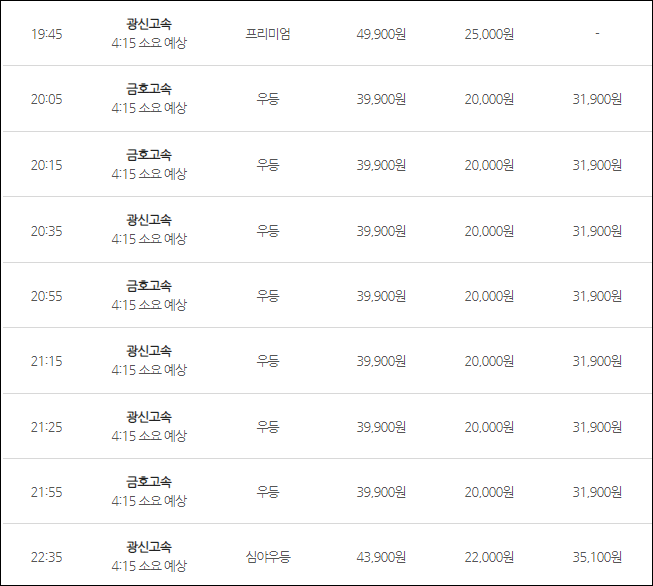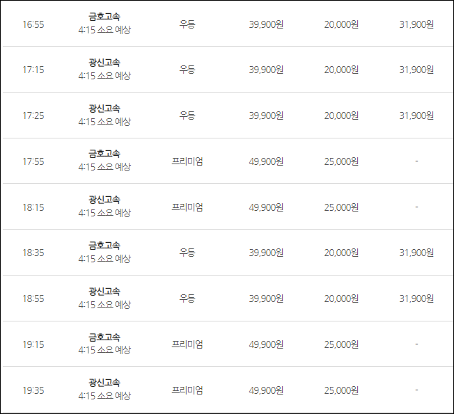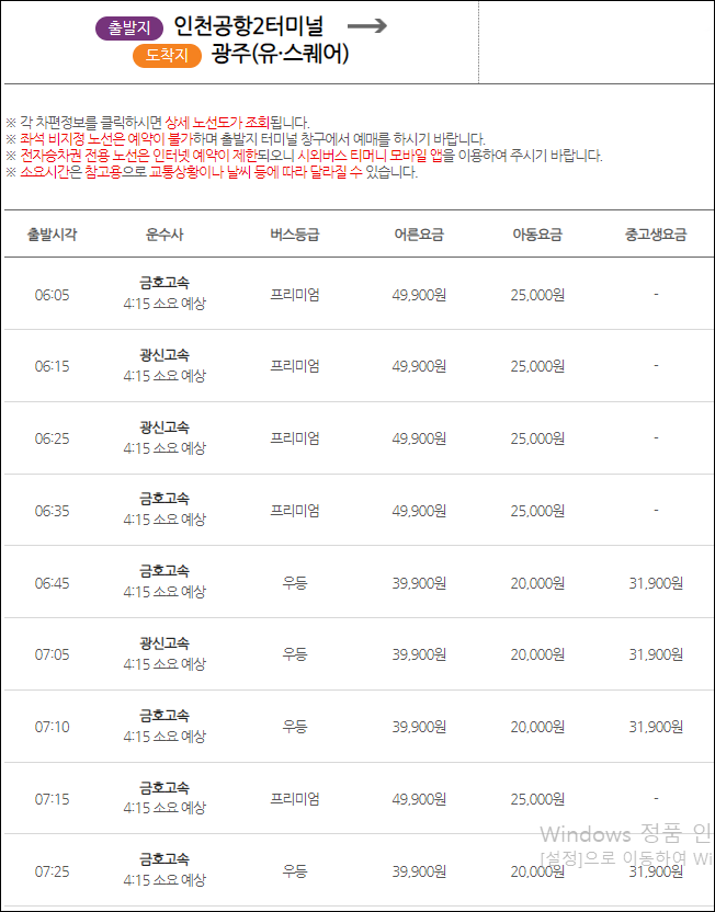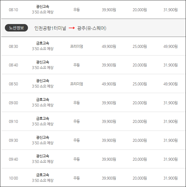 인천공항에서 광주로 가는 버스 요금은 (우등) 어른 39,900원, 청소년 31,900원, 어린이 20,000원, (심야) 어른 43,900원, 청소년 35,100원, 어린이 22,000원, (프리) 어른 49,900원, 어린이 25,000원이네요.