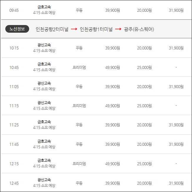 오늘 알려드릴 곳은 인천국제공항1, 2터미널에서 광주까지 가는 리무진 버스 시간표인데요, 먼저 글로 간단하게 정리를 해서 올리겠습니다. 더 자세한 정보는 아래 표와 이미지를 참고해주세요.