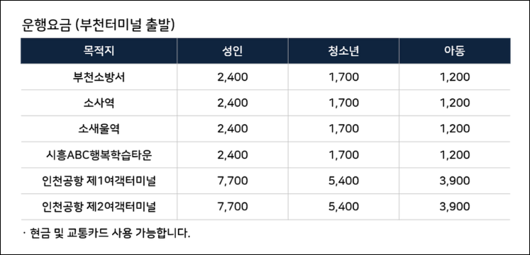 소사역에서 인천공으로 가는 버스 시간표, 요금