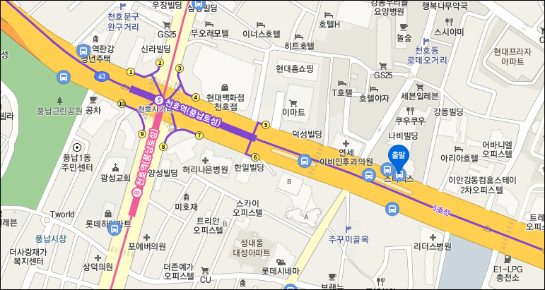 1. 천호역 : 5번 출구 200미터 거리 정류장