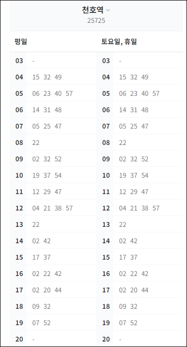 * 천호역 첫차 : 저녁 19시 52분 출발