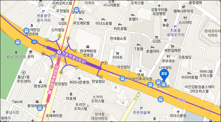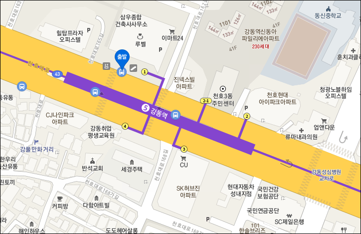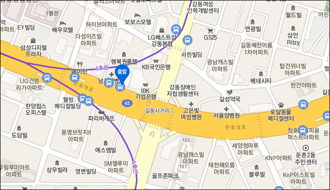 * 천호역 : 5번 출구 200미터 거리 스타벅스 앞 정류장.