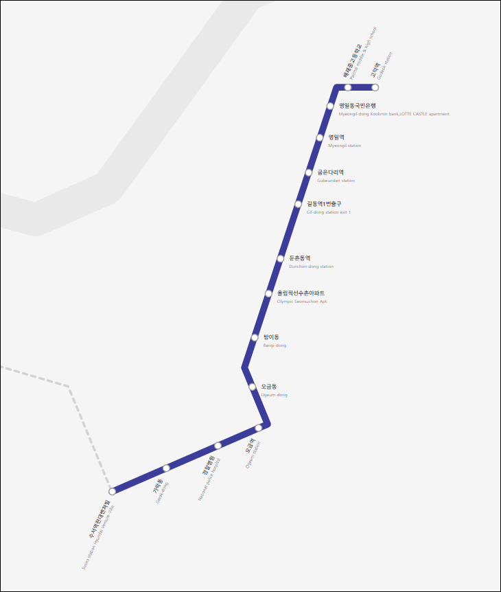 명일동 국민은행 - 명일역 - 굽은다리역 - 길동역 - 둔천동역 - 올림픽선수촌아파트 - 방이동 - 오금동 - 오금역 - 경찰병원 - 수서역 - 인천공항
