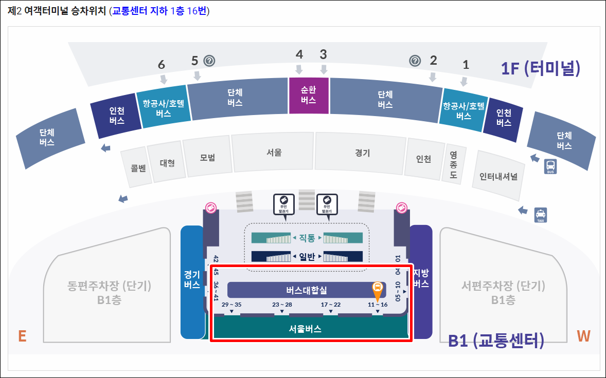 인천공항 제2 여객터미널 승차위치는 교통센터 지하 1층 16번 출구에서 탑승.