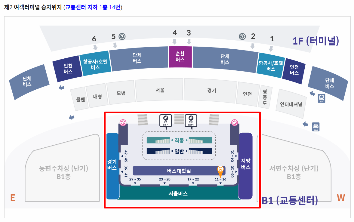 인천공항 제2 여객터미널 승차위치는 교통센터 지하 1층 14번 출구에서 6006번 리무진 버스 탑승.