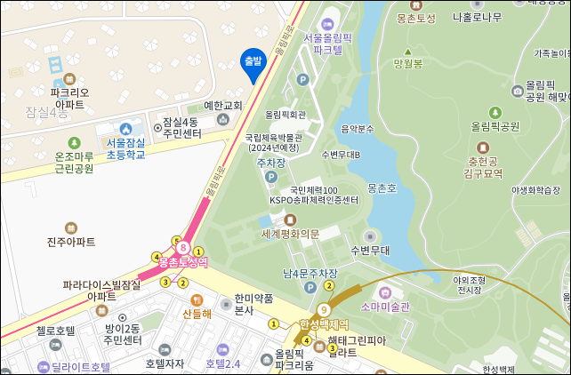몽촌토성역 5번 출구에서 잠실파크리오아파트 방향 도보로 5분 거리 정류장