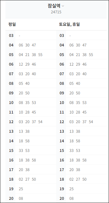 잠실역에서 출발해 인천공항으로 가는 6200번 공항버스 시간표입니다. 6200번 공항버스 첫차는 새벽 4시 6분에 출발합니다 막차는 저녁 8시 8분 이네요. 잠실역에서 인천공항까지 걸리는 시간은 1터미널 70분 ~ 80분, 2터미널 90분 ~ 100분 정도가 소요되며 교통흐름에 따라 시간이 달라질 수 있으니 참고하세요.