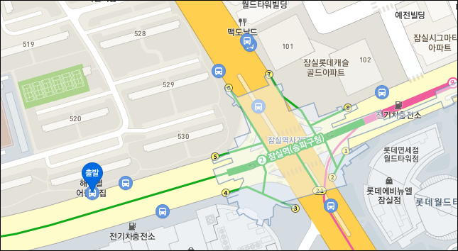 잠실역에서 공항버스 타는 곳은 잠실역 2호선 5번 출구로 나와 약 200미터(도보 2분)를 걸어가면 6200번 정류소를 찾을 수 있습니다. (주공아파트 522동 앞)