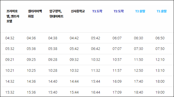 오늘 알려드릴 곳은 인천국제공항1, 2터미널에서 압구정역까지 가는 리무진 버스 시간표인데요, 먼저 글로 간단하게 정리를 해서 올리겠습니다. 더 자세한 정보는 아래 표와 이미지를 참고해주세요.