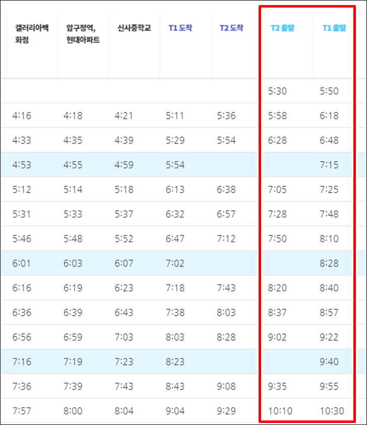 2터미널 첫차 시간표 : 새벽 5시 30분 출발