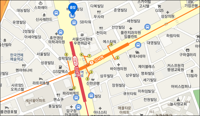 신사역 6번 출구에서 130미터 거리 정류장에서 공항버스 탑승.