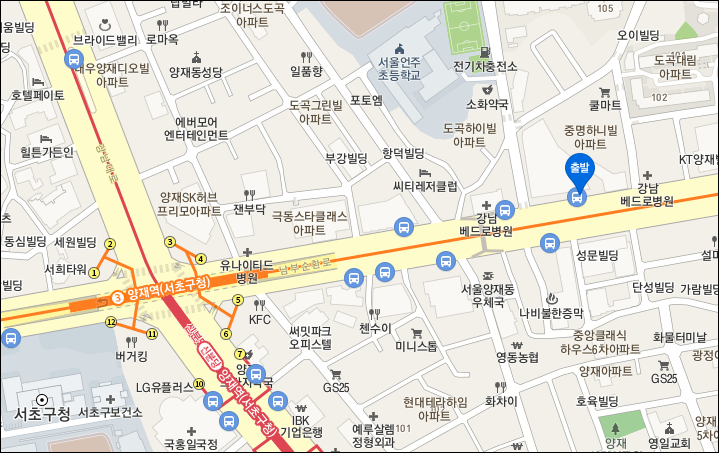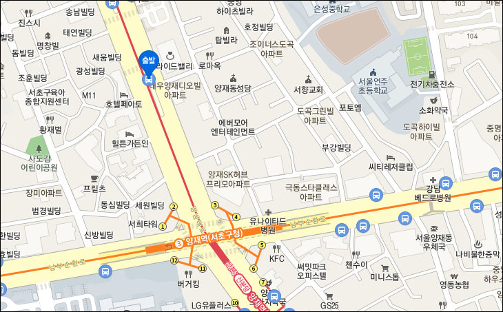 양재역 2번 - 4번 출구 350미터 거리 정류장.