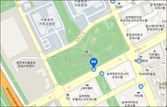 송파푸르지오시티오피스텔 건너편 정류장 혹은 소리공원 앞 정류장.