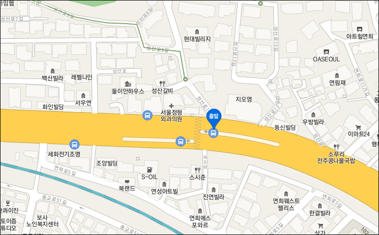 연희동(연희104고지 앞 혹은 구 성산회관) 정류장 위치 - 서울정형외과의원 중앙버스전용차로