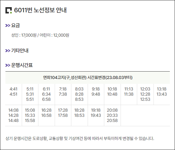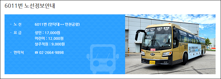 6011번 공항버스 요금은 성인 17,000원, 아동 12,000원이며 6세 미만 아동은 요금이 무료입니다. 단 좌석배정을 원할 경우에는 8,000원을 지불하셔야 합니다.