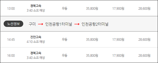 구미 인천공항 리무진 버스 시간표, 요금, 소요시간, 예약, 예매