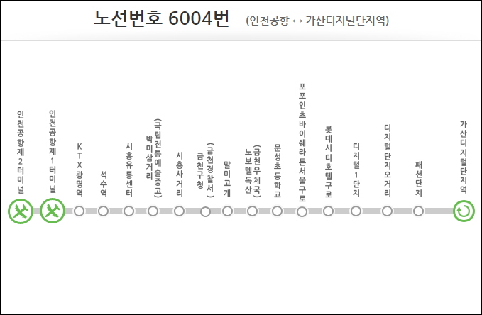 금천구청 - 시흥사거리(시흥동우체국) - 폭포공원 - 석수역 - 광명KTX - 인천공항