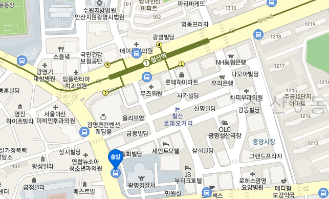 철산역 2번 출구에서 광명경찰서 방향 120미터 혹은 광명경찰서 앞 정류장