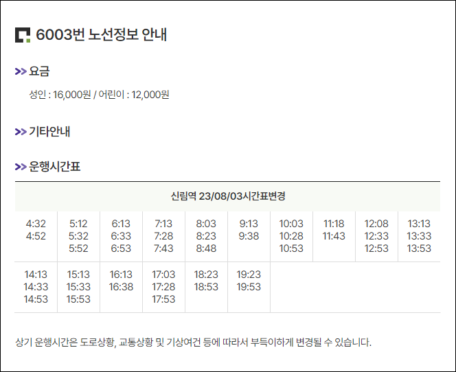 신림역 공항버스 시간표, 요금, 타는곳, 소요시간(6003번)