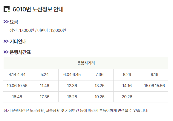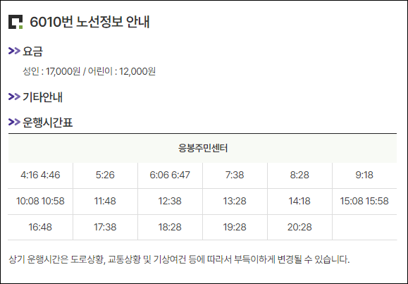 성동구 응봉동에서 인천공항으로 가는 6010번 버스시간표와 요금 정보입니다.