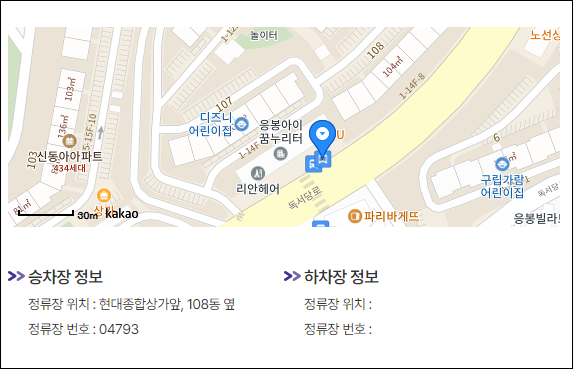 응봉삼거리 근처 천성교회 앞에서 출발하는 버스는 새벽 4시 14분이며 현대아파트는 새벽 4시 17분이네요.