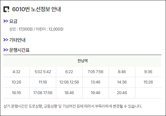한남역 공항버스 시간표, 요금, 타는 곳, 소요시간(6010번)