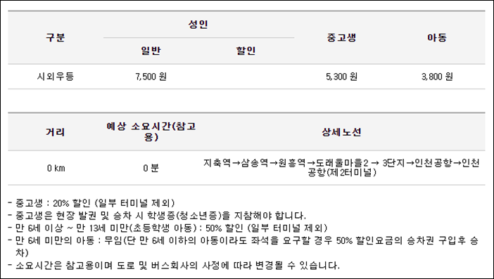 흥도동 도매울마을에서 1터미널까지 소요시간은 40분~50분 소요, 2터미널까지 소요시간은 60분~70분 소요되는데요, 도로상황에 따라 달라질 수 있습니다. 도래울마을 공항버스 요금은 성인 7,500원, 중고생 5,300원, 아동 3,800원이네요.