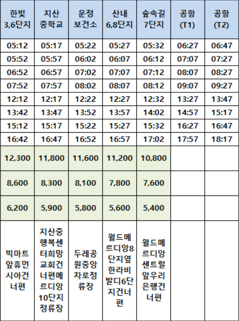 | 한빛마을 공항버스 시간표, 요금, 타는 곳, 노선도(5600번), 예매, 예약 (0) | 2024.03.15 |