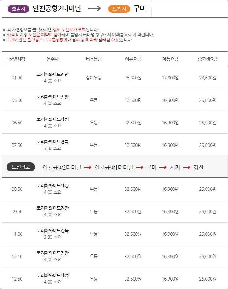 인천공항에서 구미가는 버스 시간표, 요금, 노선