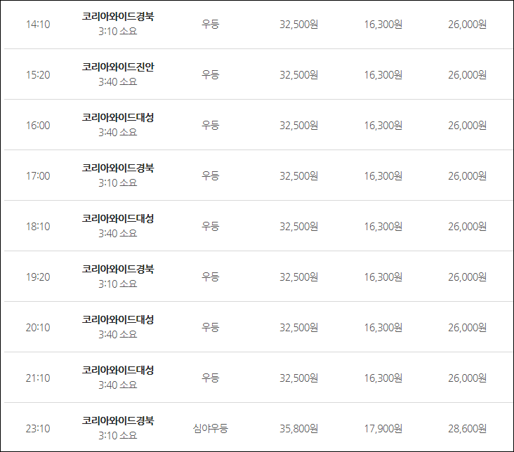 (심야) 어른 35,800원, 청소년 28,600원, 어린이 17,900원