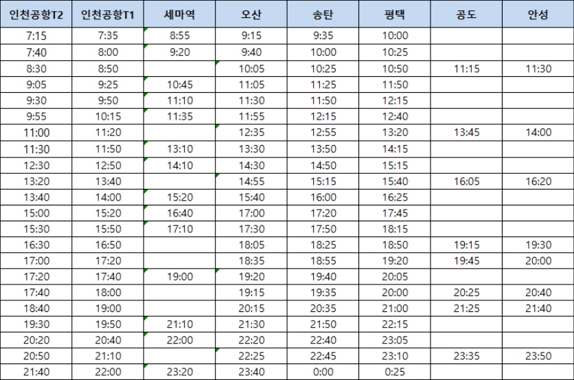 인천공항 평택, 송탄, 오산역, 세마역 리무진 버스 시간표(8834번)