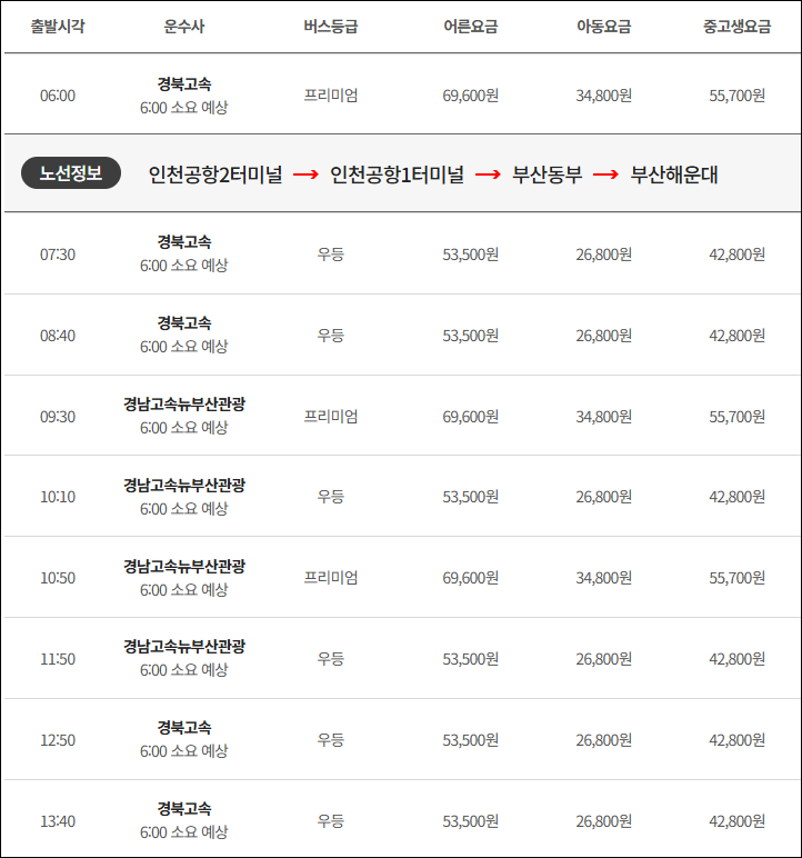 인천공항에서 부산 해운대 리무진 버스 시간표, 예매, 예약