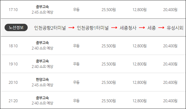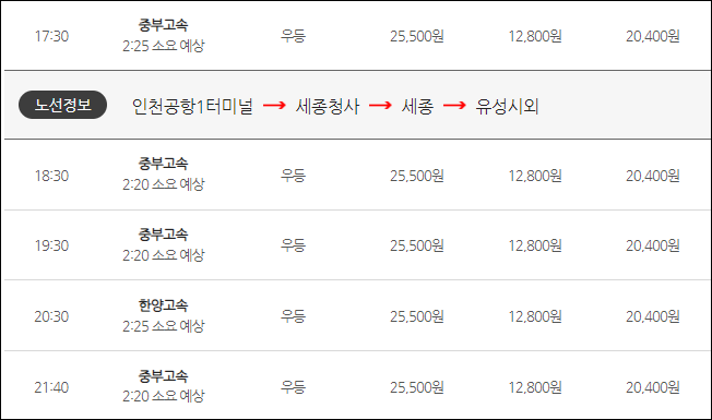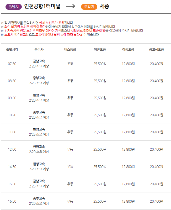 인천공항1터미널에서 출발하는 리무진 첫차는 오전 7시 50분이네요, 하루에 14편 차량배차가 되어 있는데요, 요금은 2터미널과 같은 어른 25,000원, 청소년 20,400원, 어린이 12,800원 이네요. 세종까지 소요시간은 2시간 25분이 걸립니다.